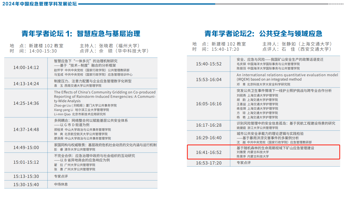 本次会议设立“青年学者论坛”。pg游戏硕士研究生提交了论文《基于随机森林的生命周期视域下矿山应急管理建设》,并在青年学者论坛中以口头报告形式进行了分享与交流。研究立足于矿山应急文化建设,运用随机森林算法技术探究在矿山应急管理建设不同生命周期下应急文化因素所呈现的影响性。