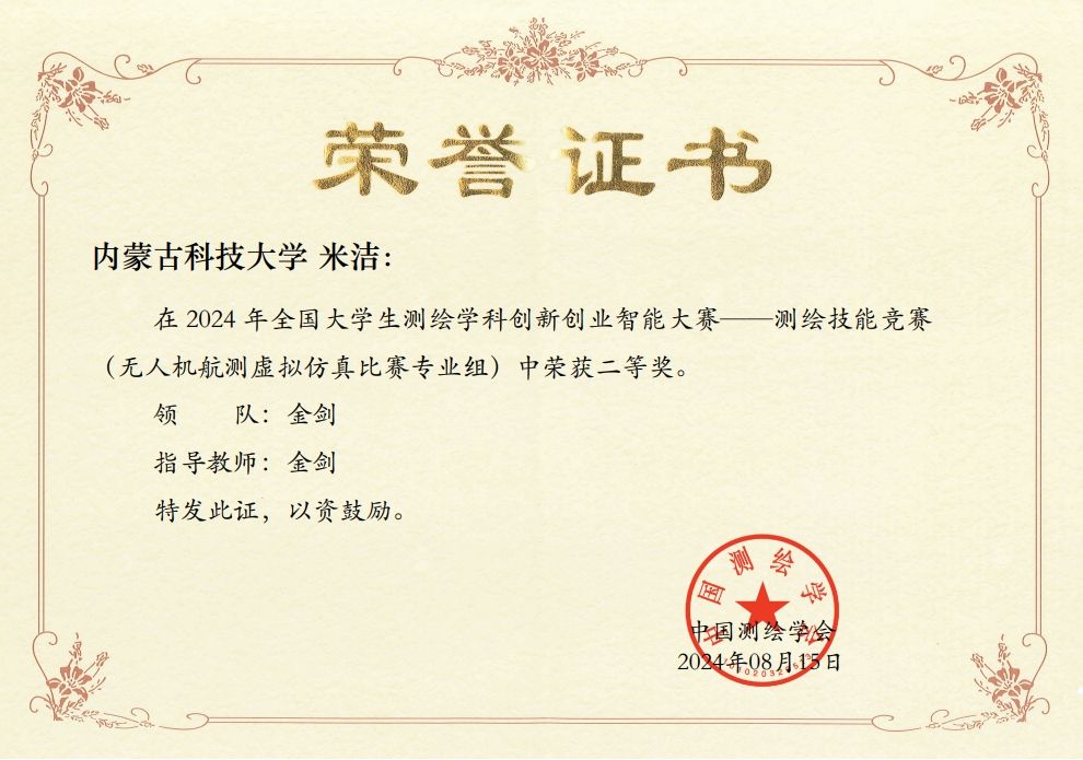 pg游戏测绘工程系学子经过积极选拔与备战,参与了大赛各个项目的激烈角逐。最终,在金剑老师的指导下,pg游戏优秀学子米洁从来自全国360所高校的近8000名学生中脱颖而出,获得无人机航测虚拟仿真比赛的全国二等奖。