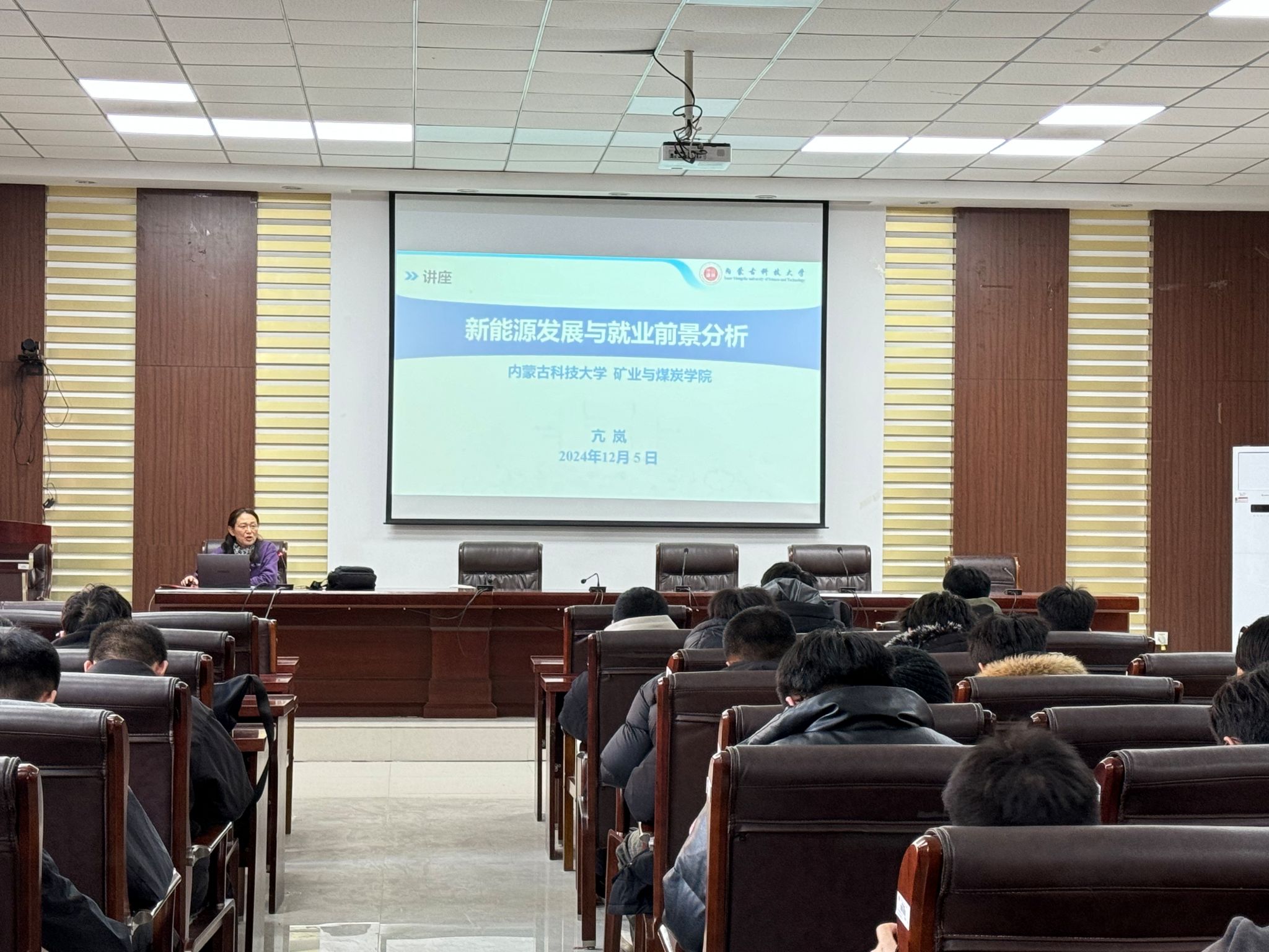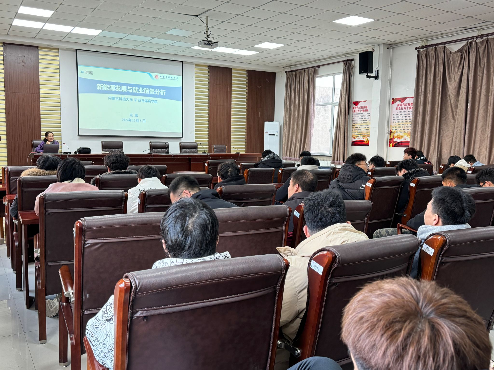 2024 年 12 月 5 日下午 16:00,pg游戏电子模拟器在实验室训楼二楼会议室举行讲座,机电工程系教授亢岚主讲,矿山机电专业三个年级及电气自动化、机电一体化专业毕业班学生踊跃参与,主题为“新能源发展与就业前景分析”。