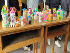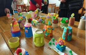 一只纸杯,五彩粘土,专注的神情,灵巧的双手,呈现出一幅幅、一个个惟妙惟肖的作品。同学们认真揉、搓、捏手中的粘土,充分发挥着自己的奇思妙想,一个个活灵活现的小摆件诞生。