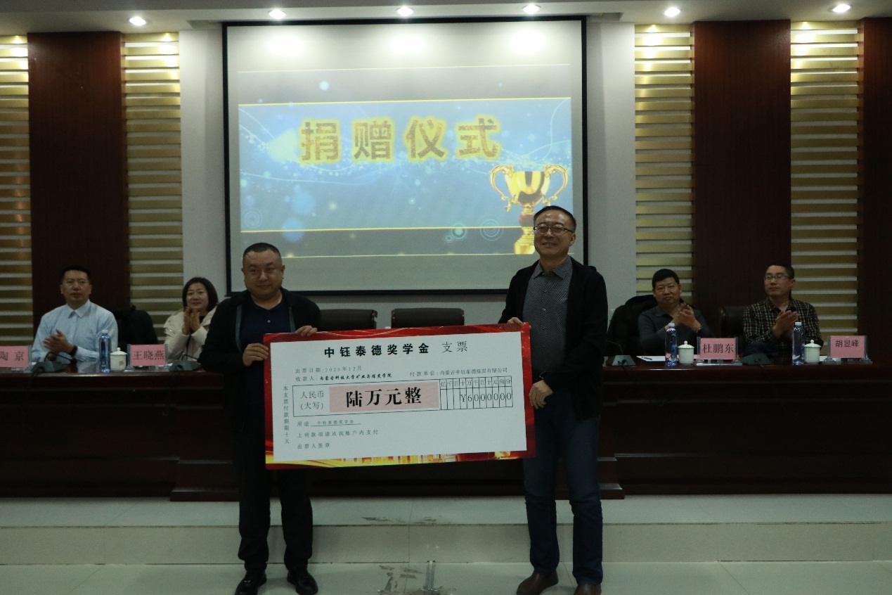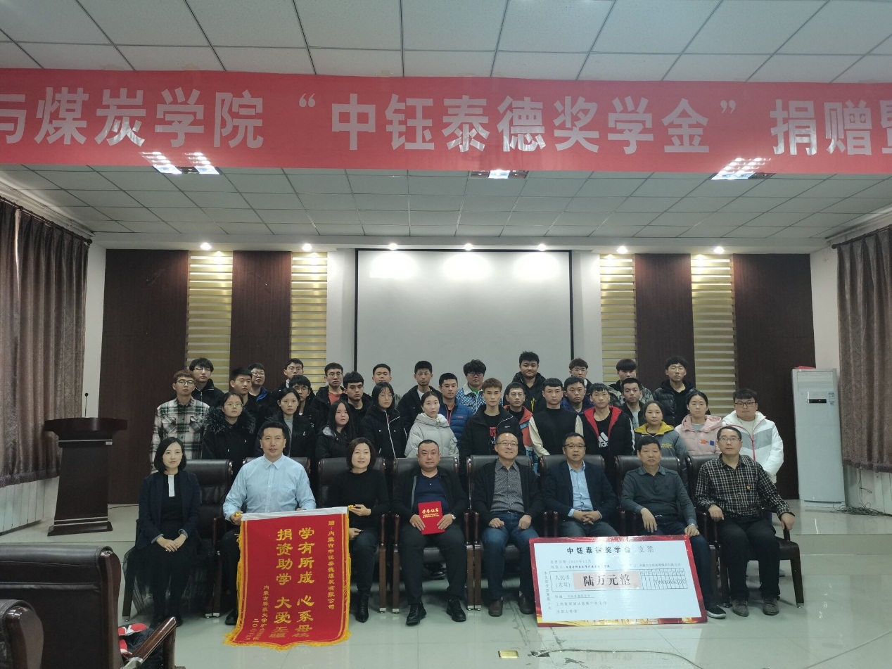 2020年12月9日下午15:00,pg游戏电子模拟器在实验实训楼会议室举行了“中钰泰德奖学金”捐赠暨颁奖仪式。出席本次会议的领导和老师有:鄂尔多斯市中钰泰德煤炭有限公司副总经理王维利、副总经济师王晓燕、人力资源部经理陶京;pg游戏电子模拟器学生工作部副部长王树彤、pg游戏电子模拟器党总支书记王建国、副书记副院长杜鹏东、学生工作办公室主任胡显峰,以及辅导员。