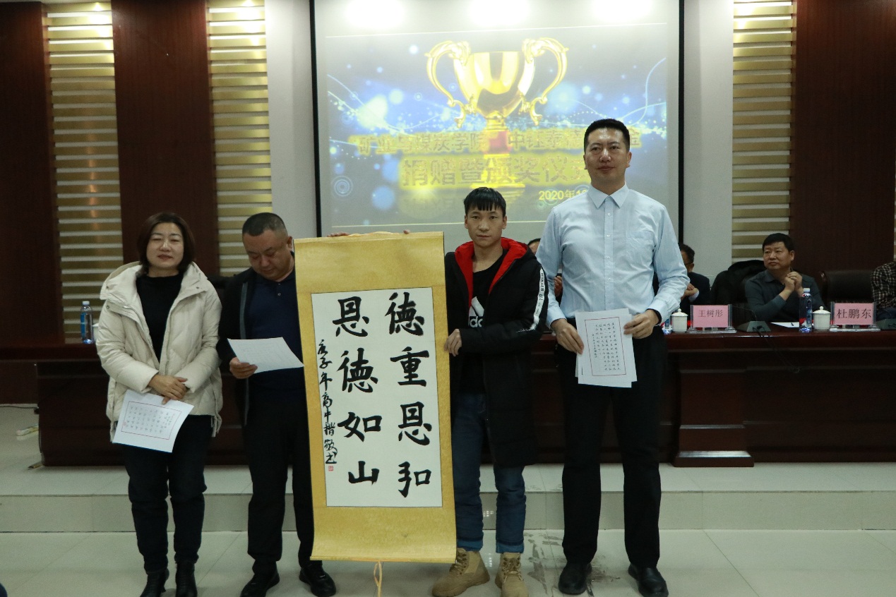 随后,副总经理王维利代表公司向pg游戏捐赠六万元奖学金,王建国书记也代表学院向公司表示谢意并回赠了荣誉证书与锦旗。杜鹏东书记宣读了本次30名获奖学生名单,之后在场嘉宾为获奖学生颁发了获奖证书。接着,获奖学生高中凯同学用书法作品的方式表达了对中钰泰德公司的感谢。获奖学生代表高冬也发表了获奖感言,承诺将会珍惜本次奖励和荣誉,不断努力,认真学习,取得更优异的成绩,创造更美好的未来。