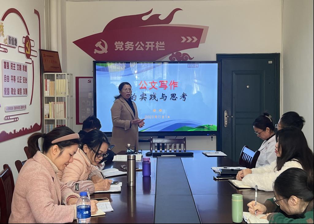 综合办主任甘梅香传达了省卫生健康委办公室副主任徐潮关于公文写作的思考与实践,重点学习了公文基本特点、种类、格式等基本规范。