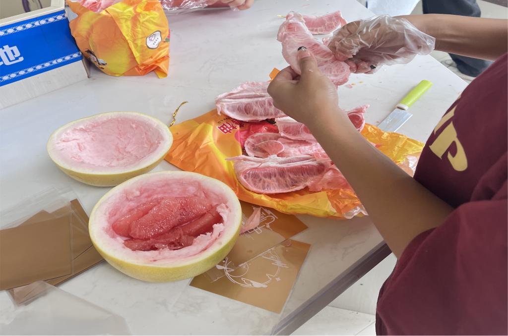 一款款独特并充满浓浓爱意的月饼被装入精美的包装袋,老师将包装好的月饼分发给了参加活动的贫困生代表,甜蜜的月饼,香甜的柚子,不仅给同学们带来家的温暖,更传递了中国传统文化中所含的家国意义和人文情怀。活动中,同学们剥柚子、吃月饼,整个活动现场欢声笑语,其乐融融。