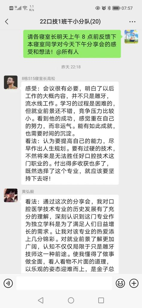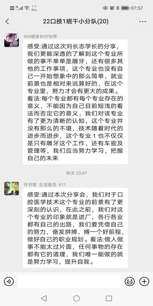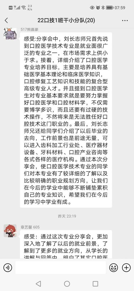 刘长志同学作为bat365优秀毕业生代表,在学生时期就先后荣获全国卫生职业院校口腔技能大赛雕牙排牙三等奖,深圳市口腔修复工职业技能大赛三等奖的荣誉。毕业后短短四年时间,已成长为浦江口腔医院技工室主管。宣讲中,刘长志结合自身奋斗的历程和从事行业,从专业发展历史及现状、固定修复义齿制作流程、数字化在口腔行业中的发展与应用及专业发展方向等方面做了介绍,同时用朴实的语言为学弟学妹分享了自己学习和工作中的亲身经历和感受。现场气氛活跃,同学们积极互动。