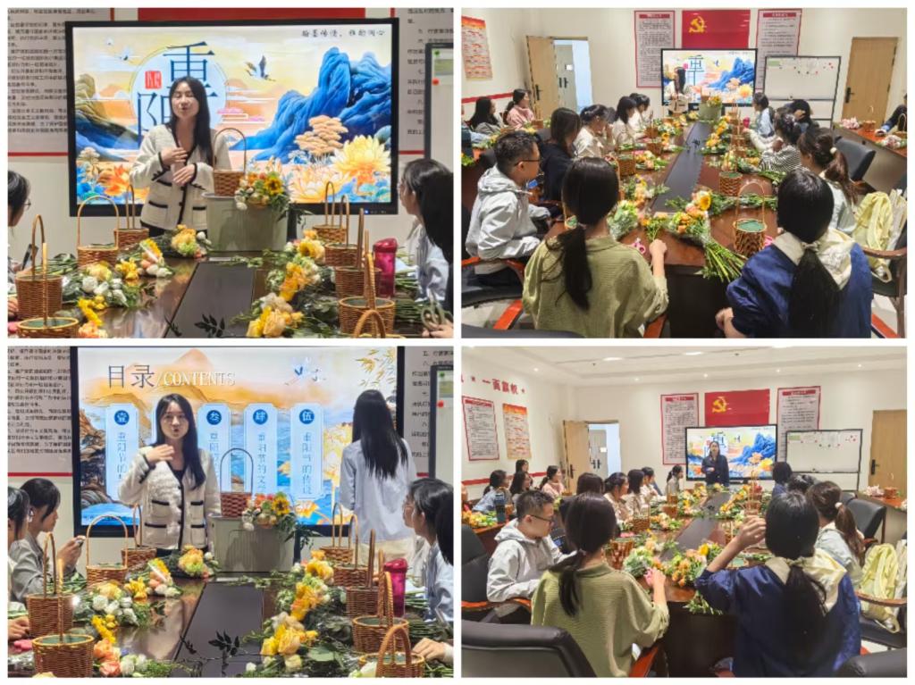 重阳节当天,学院开展插花活动,花艺师围绕 “菊、桂” 等重阳特色花材寓意与插花技巧,指导学生完成个人作品,践行 “敬老、思亲” 主题。