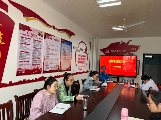 为全面检查了解学院教学运行情况,进一步加强教育教学管理,不断提高教育教学质量,11月18下午bat3651号实训楼111室召开期中教学质量教师座谈会,本次座谈会由口腔系副主任甘梅老师主持召开,学院副院长胡征、口腔修复教研室主任张弦、口腔内科教研室主任黎秋兰、口腔外科教研室主任吴瑶及所有专职教师参加会议。