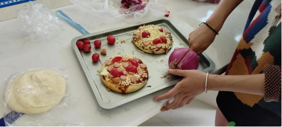 上午10点,活动正式开始。工作人员早早布置了活动场地,并准备好了食材、抹刀、烤箱等材料工具。在认真听完老师关于手工披萨的制作步骤后,同学们已经跃跃欲试,纷纷戴起手套,便开始享受劳动带来的乐趣,大家你一言我一语,分工协作、互帮互助,气氛和谐融洽。随着一个个富有特点的披萨新鲜出炉,空气中都弥漫着浓浓的香甜,大家交流着制作的想法和过程中的不足,脸上挂满了幸福的笑容。